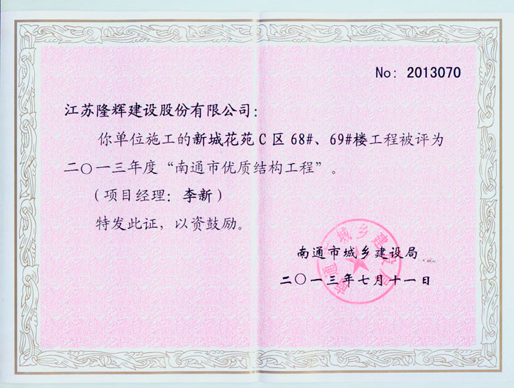 新城2期68.69#楼市优质结构工程证书